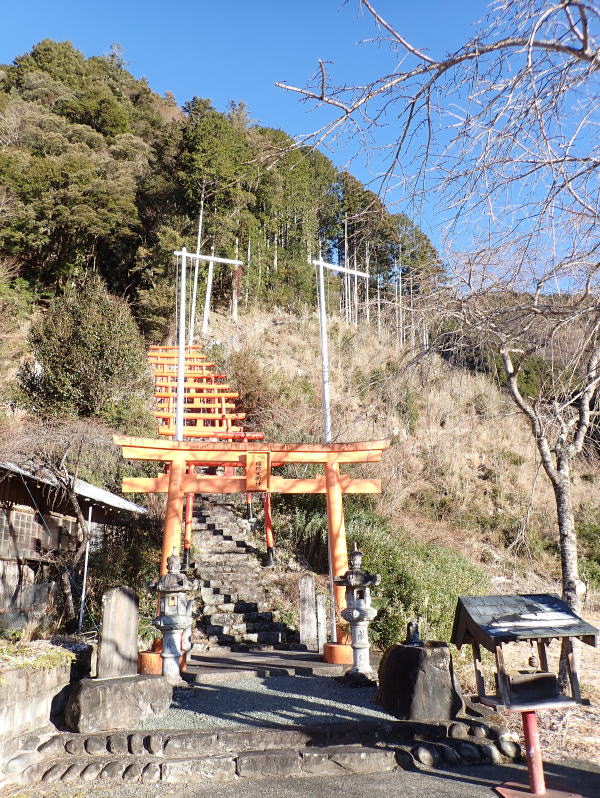 車で登ってきた林道を下り、約45分ほどで「七人作りの尾根」の末端にあたる新田地区の「稲荷大明神」鳥居の前へ。