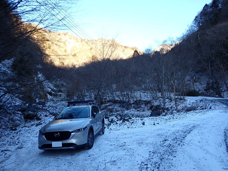 朝6時に自宅を出発し、7時半頃には大谷崩の入口となる林道へ。予想通り前日に降った雪の影響で、林道の路面はガチガチの凍結状態。