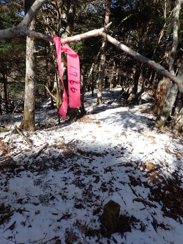 やがて小ピークに達すると、そこには「1766」と記された赤テープと、その下には三角点も。