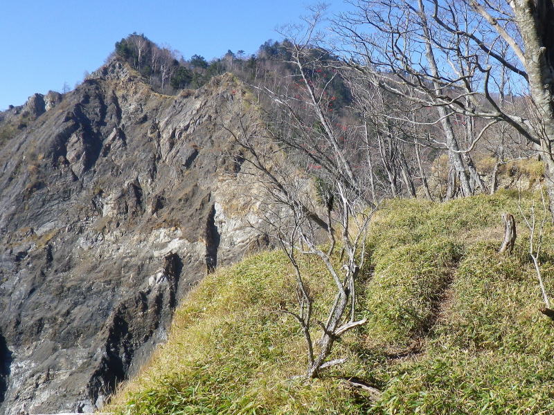 なるべく縁側を避け、立木を伝いながら登りますが、可能であれば補助ロープを出した方が安心でしょう。