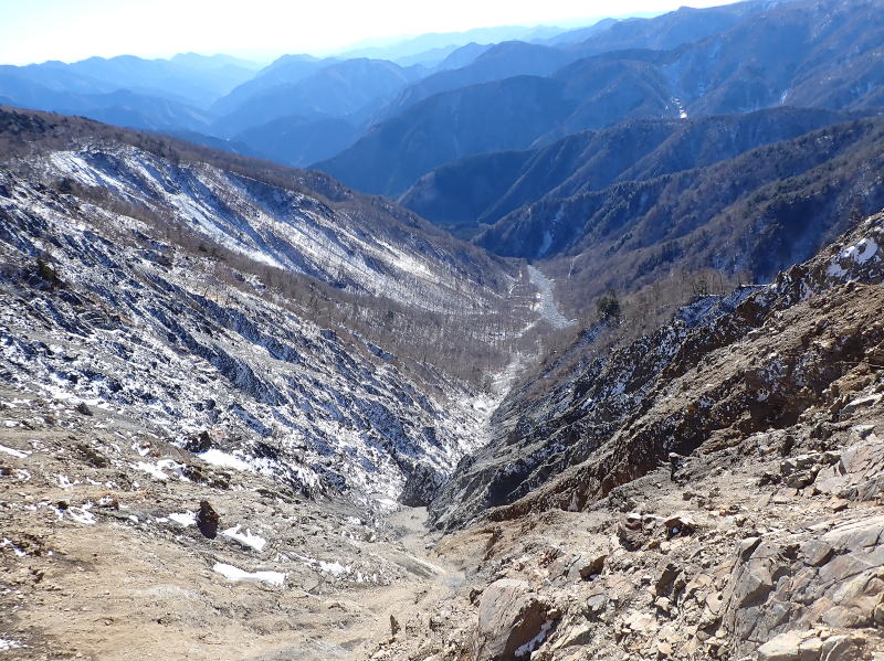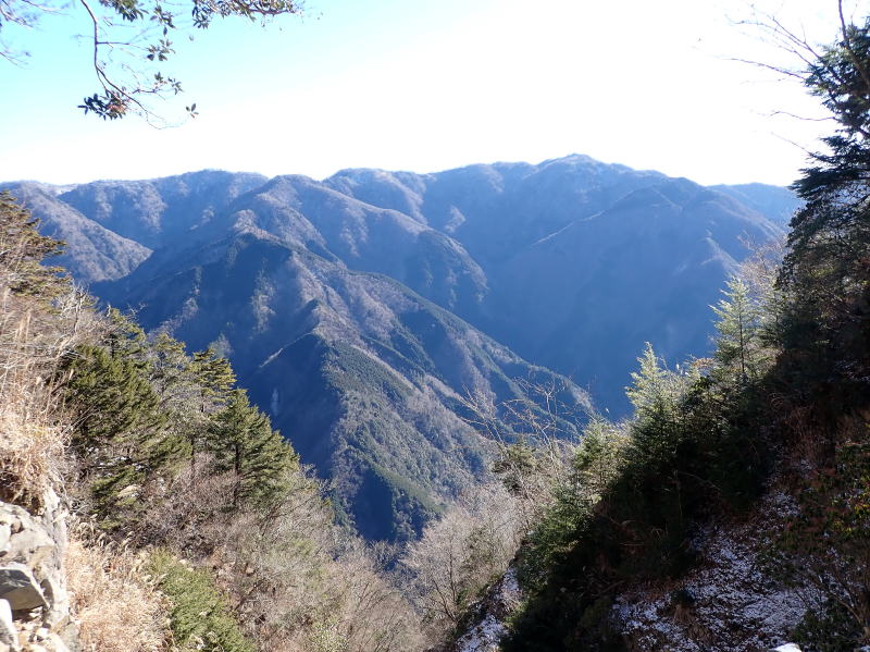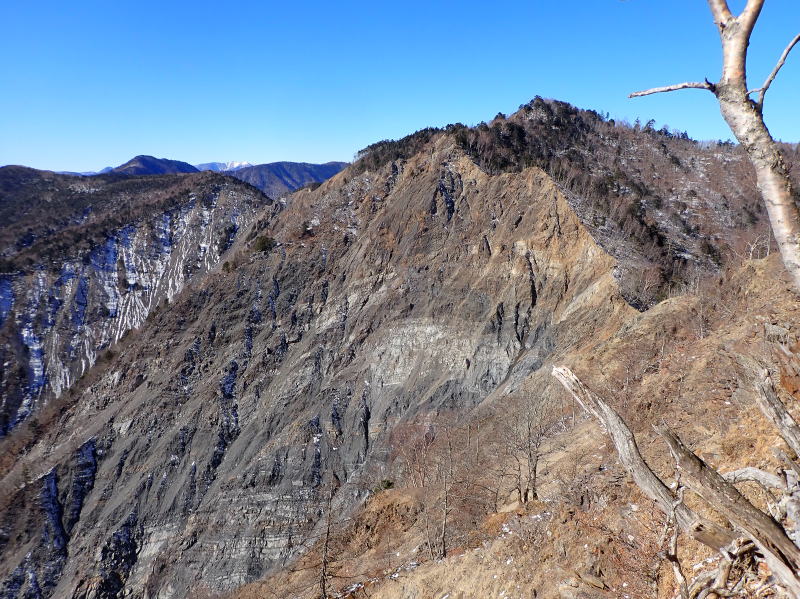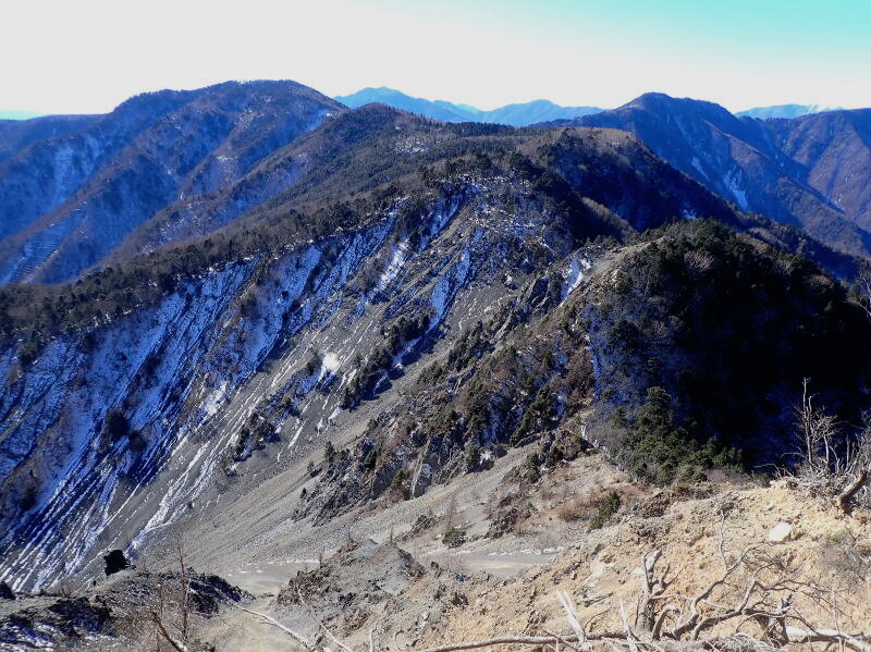 一つ目のピークを過ぎると、直ぐに展望の良い崩落箇所が現れ、そこからは、お馴染みの安倍東山稜が良く見えました。右のピークが大光山かな?