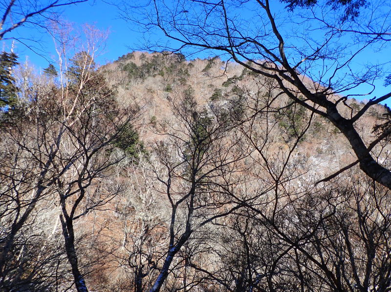 だらだらと標高を下げていくと、林越しには、これから向かう「ハチビツ山」の山頂がお目見え。