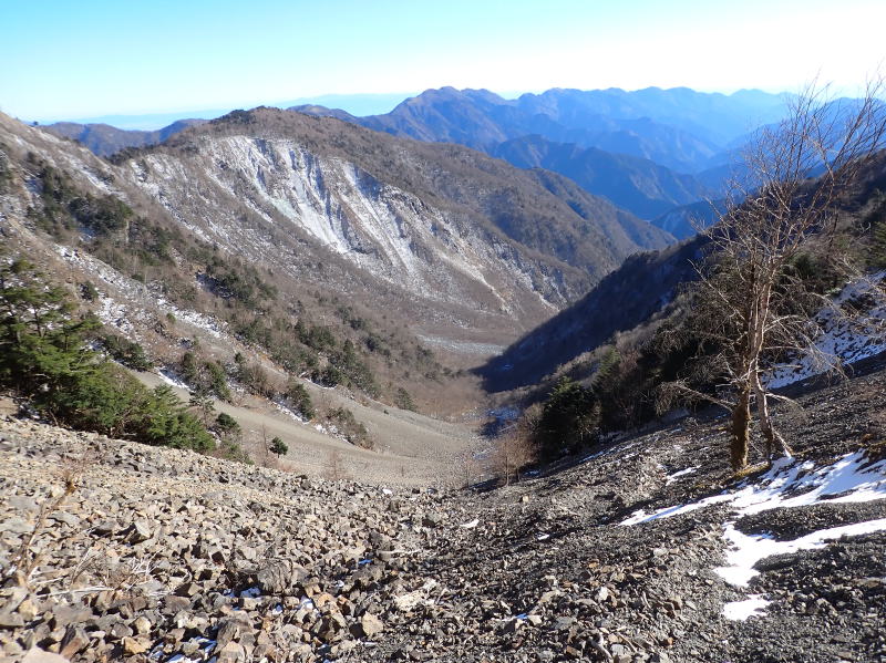 更に下ると、最後は雪の付いた急斜面となり、立木を頼りに慎重に下降して「七段沢」のコルへ。