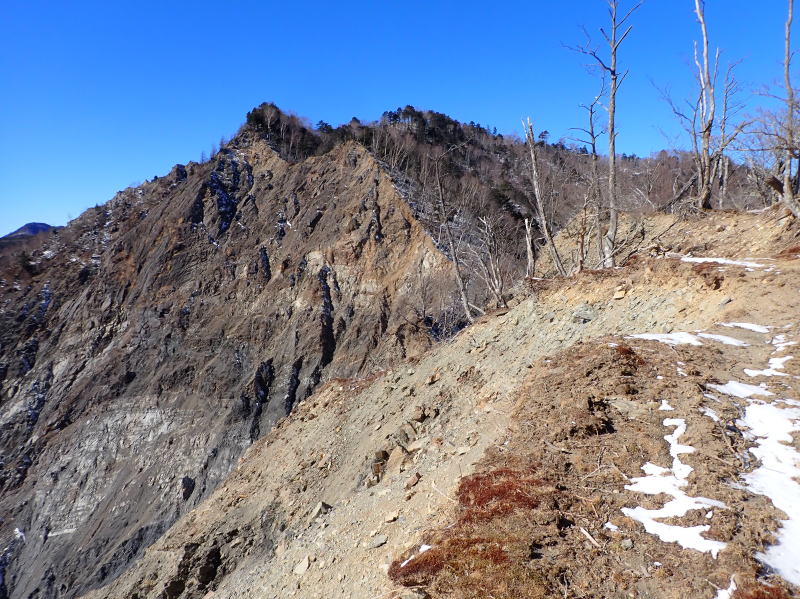 ハチビツ山の山頂で昼休憩を取り、大谷嶺へ向けて再びガレ場の縁沿いを進みます。