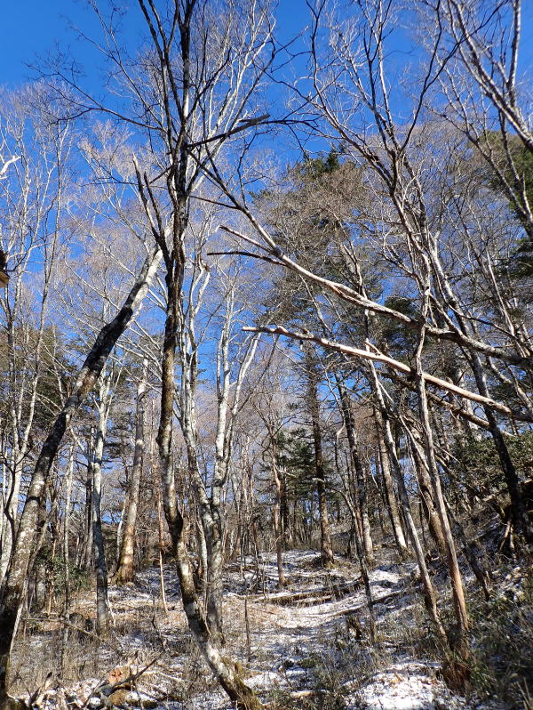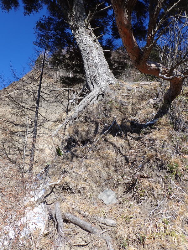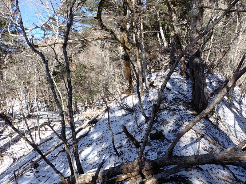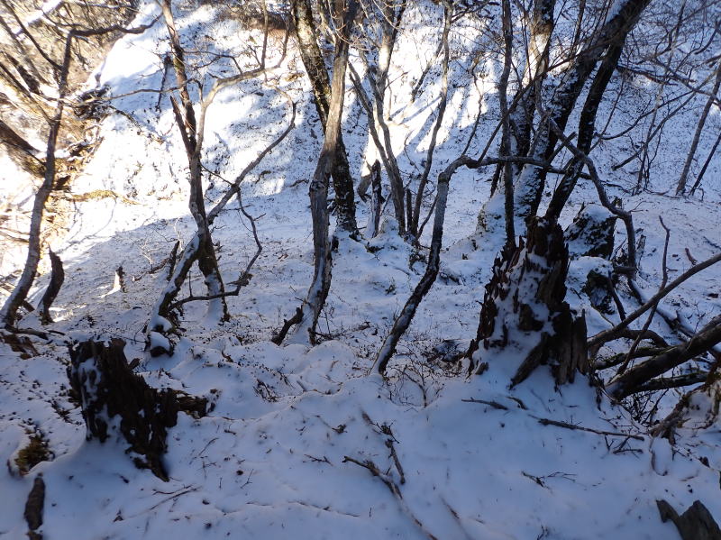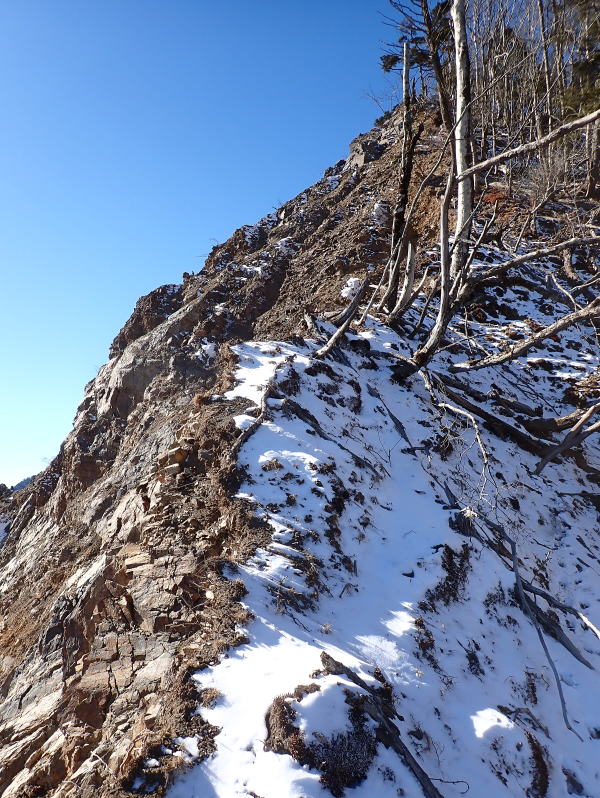 下りも怖いですが、この急な登りもなかなかのもの。縁側を直登せず、右側の雪が残る林内の獣道を選んで登っていきます。