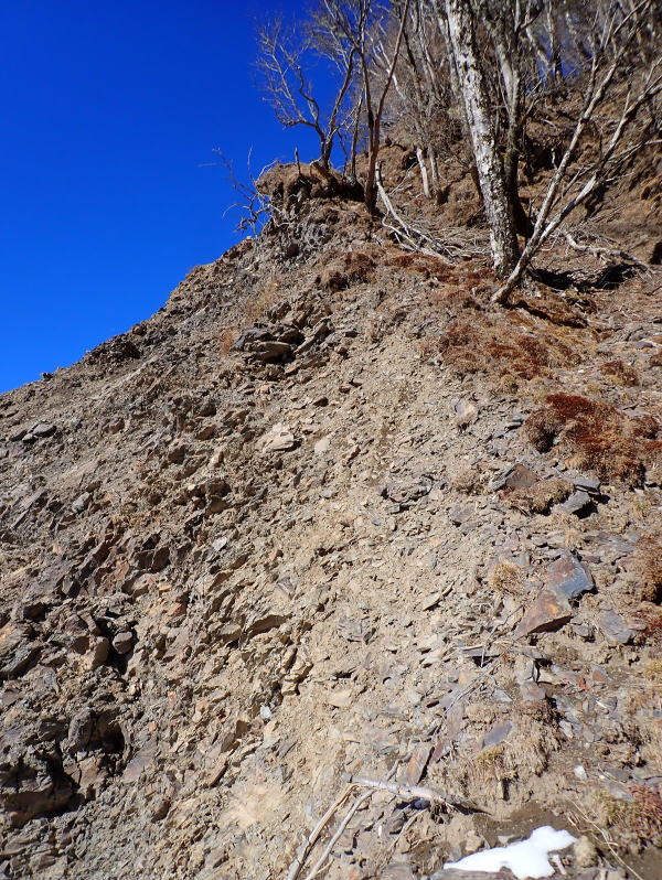 その笹は跡形もなく消え、現在はザレザレの斜面に変わっていました。ここからは滑落リスクが非常に高くなり、十分な注意が必要。