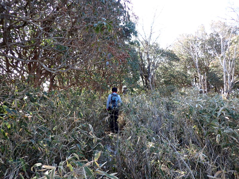 青笹山の山頂から南側へ下る登山道は、相変わらず身を没するほどの笹薮で、まさに平泳ぎ状態。